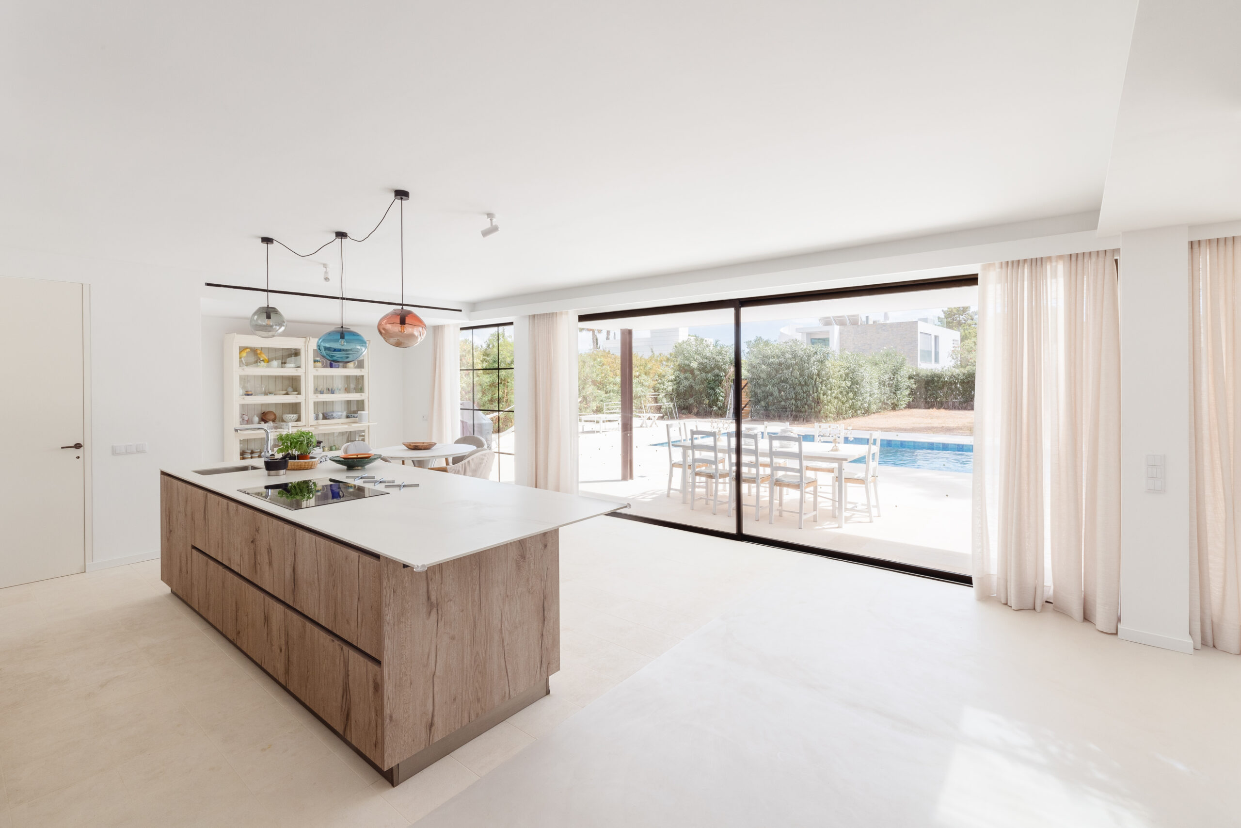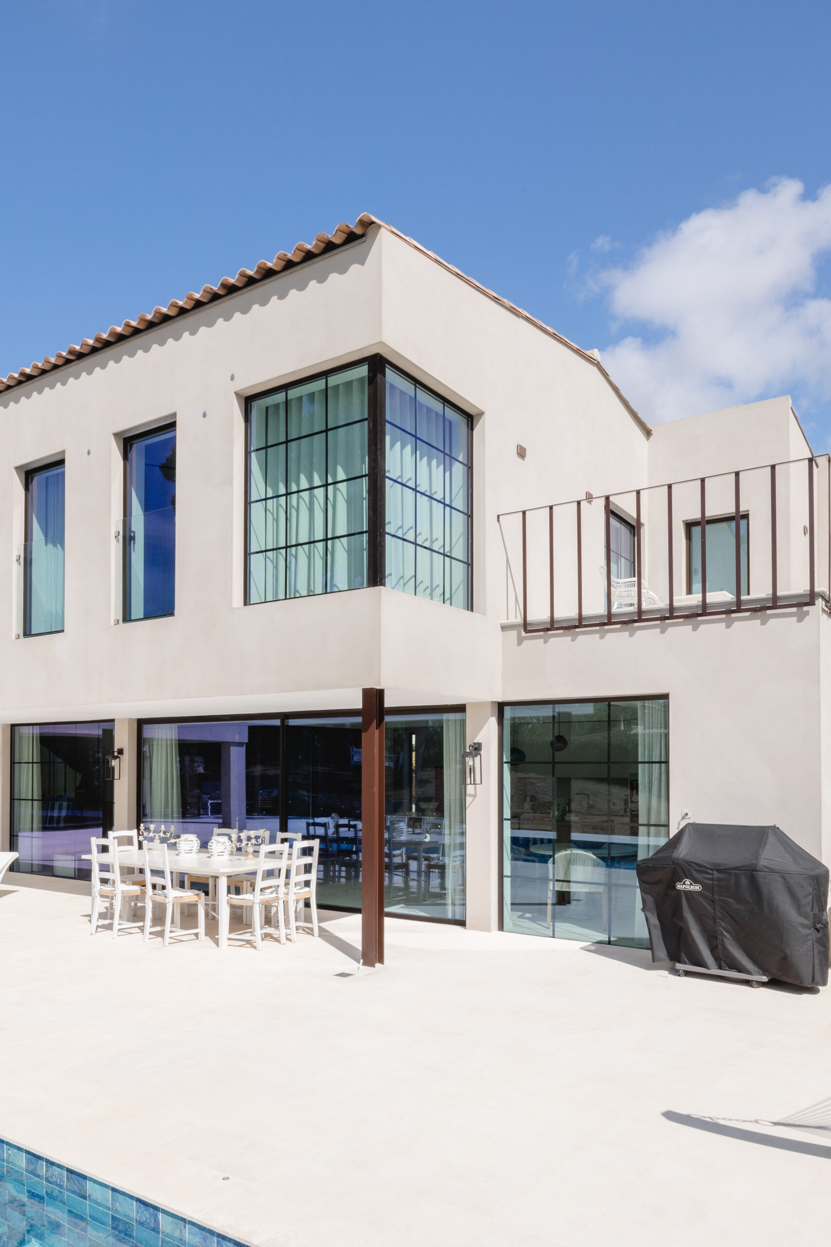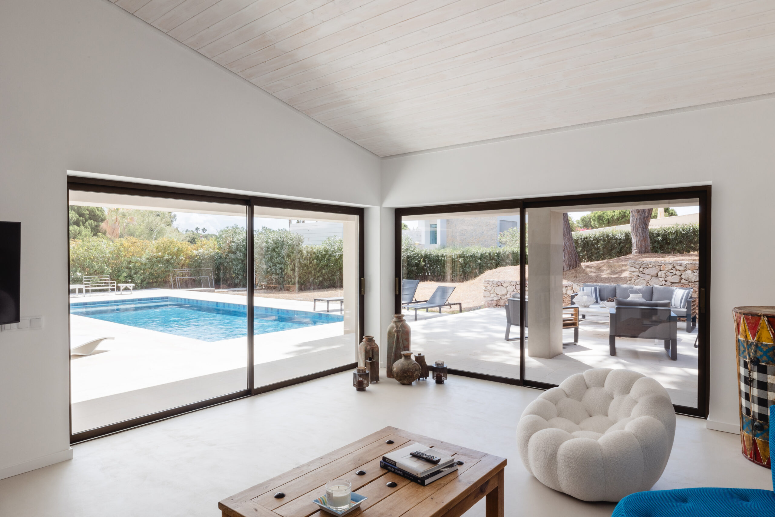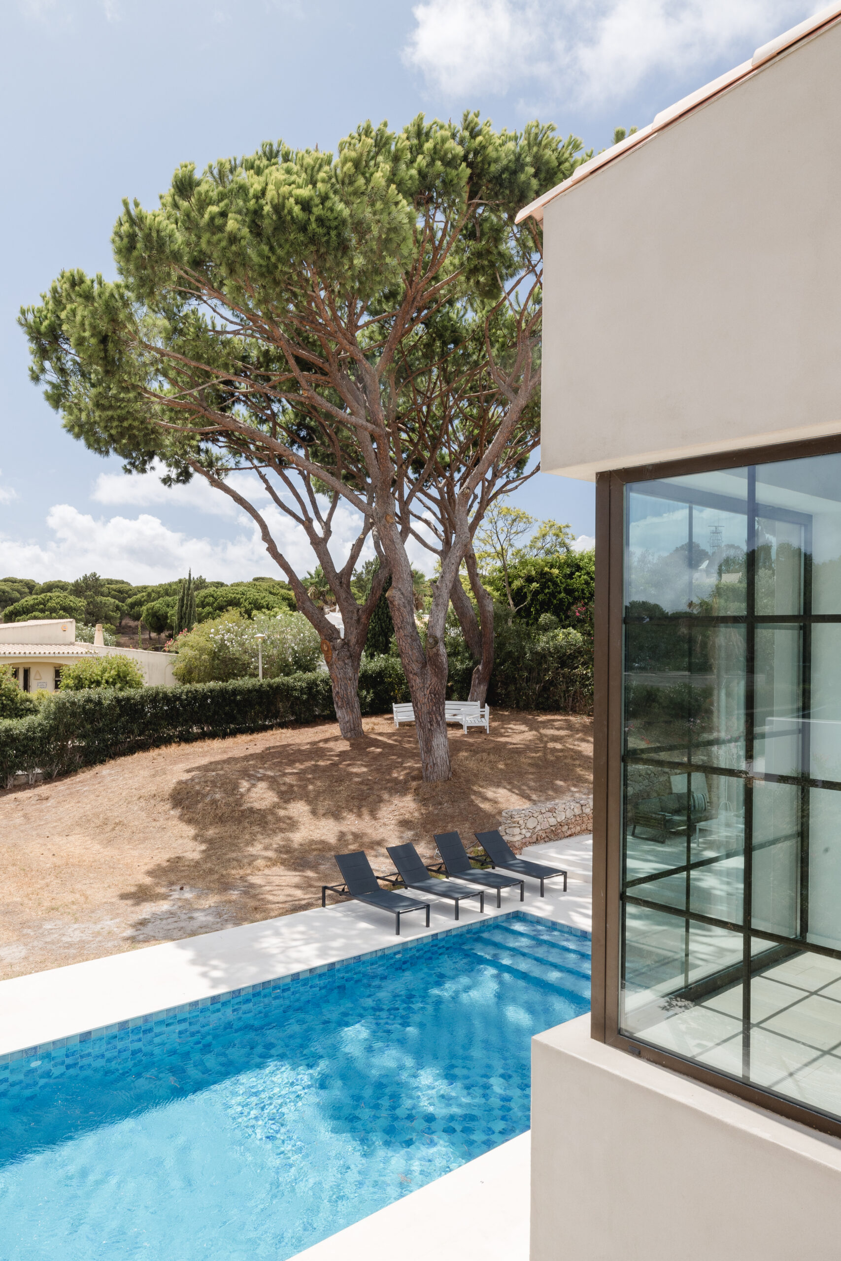 Located near the Ria Formosa, Natural Reserve on the Algarvian coast, Casa Azinheira is a family holiday home that has been refurbished to meet the evolving needs of a growing London family, complete with several grandchildren. The goal was to create a space that provided privacy for adult children and their families while allowing them to enjoy the house together without feeling crowded. The house capitalizes on the beautiful Ria Formosa views, especially in the master bedroom, which features a sun terrace.