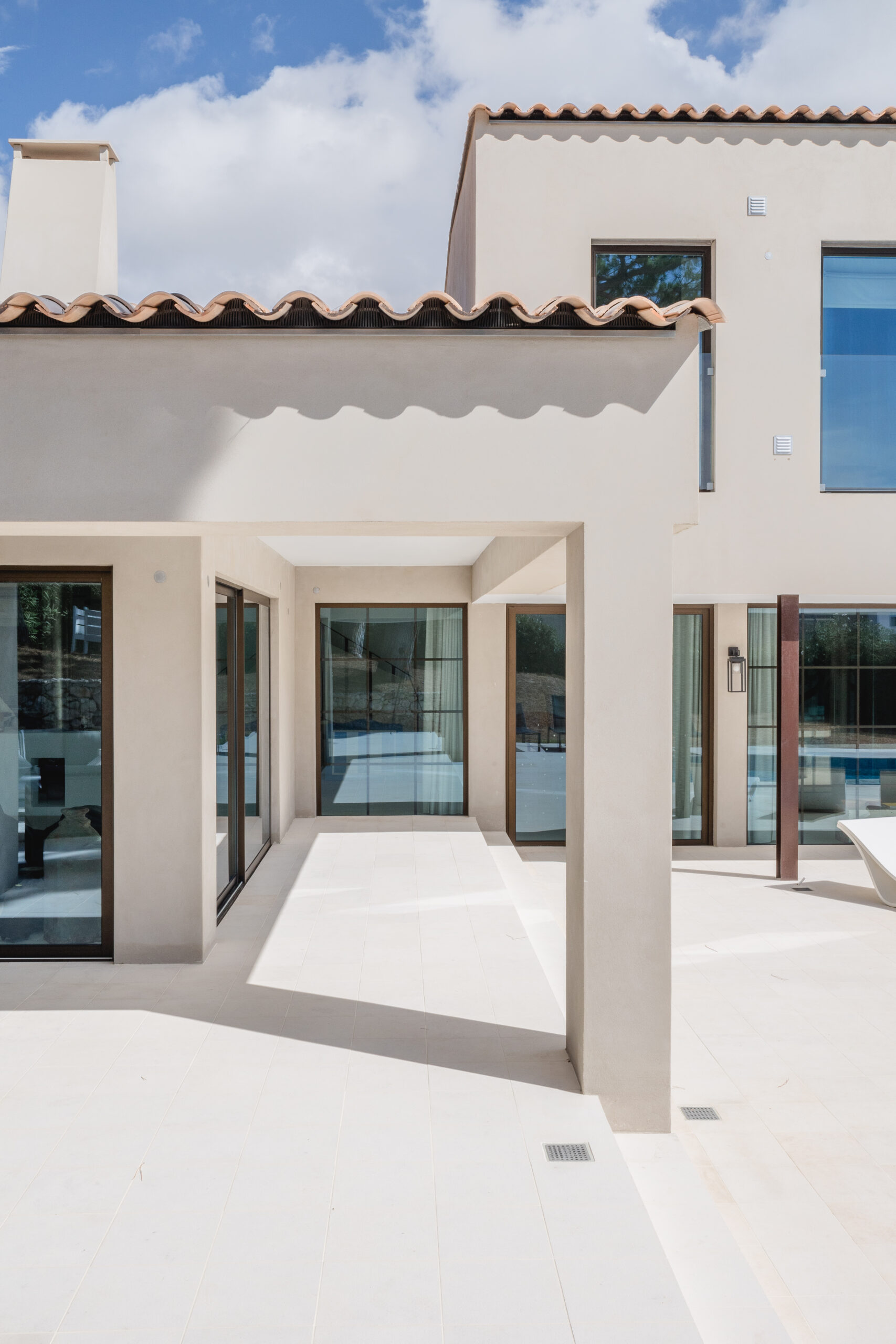 The guest rooms located on either side of the patio offer ample privacy for young families with children. Surrounding the patio is an open-plan kitchen and a spacious living room that open onto large outdoor terraces leading to the pool. The house comprises six spacious en-suite bedrooms, ensuring comfort and privacy for all occupants. The open space concept of the kitchen and living room promotes a sense of spaciousness and togetherness, ideal for family gatherings.