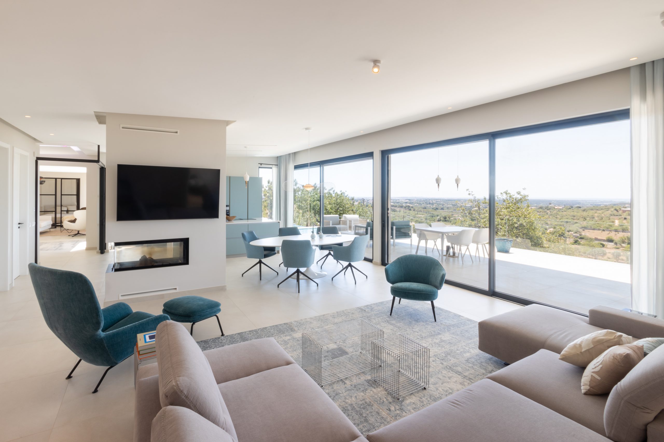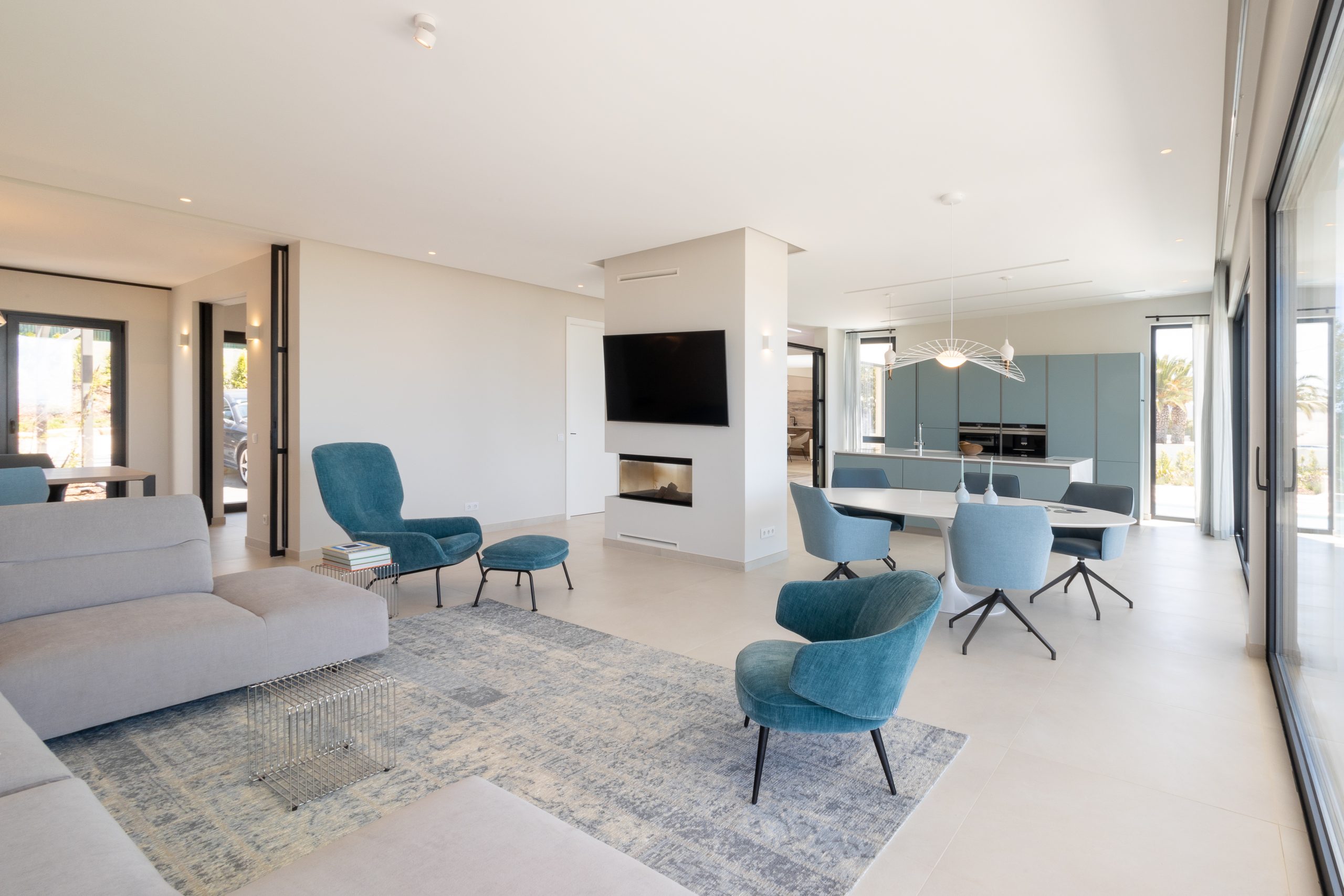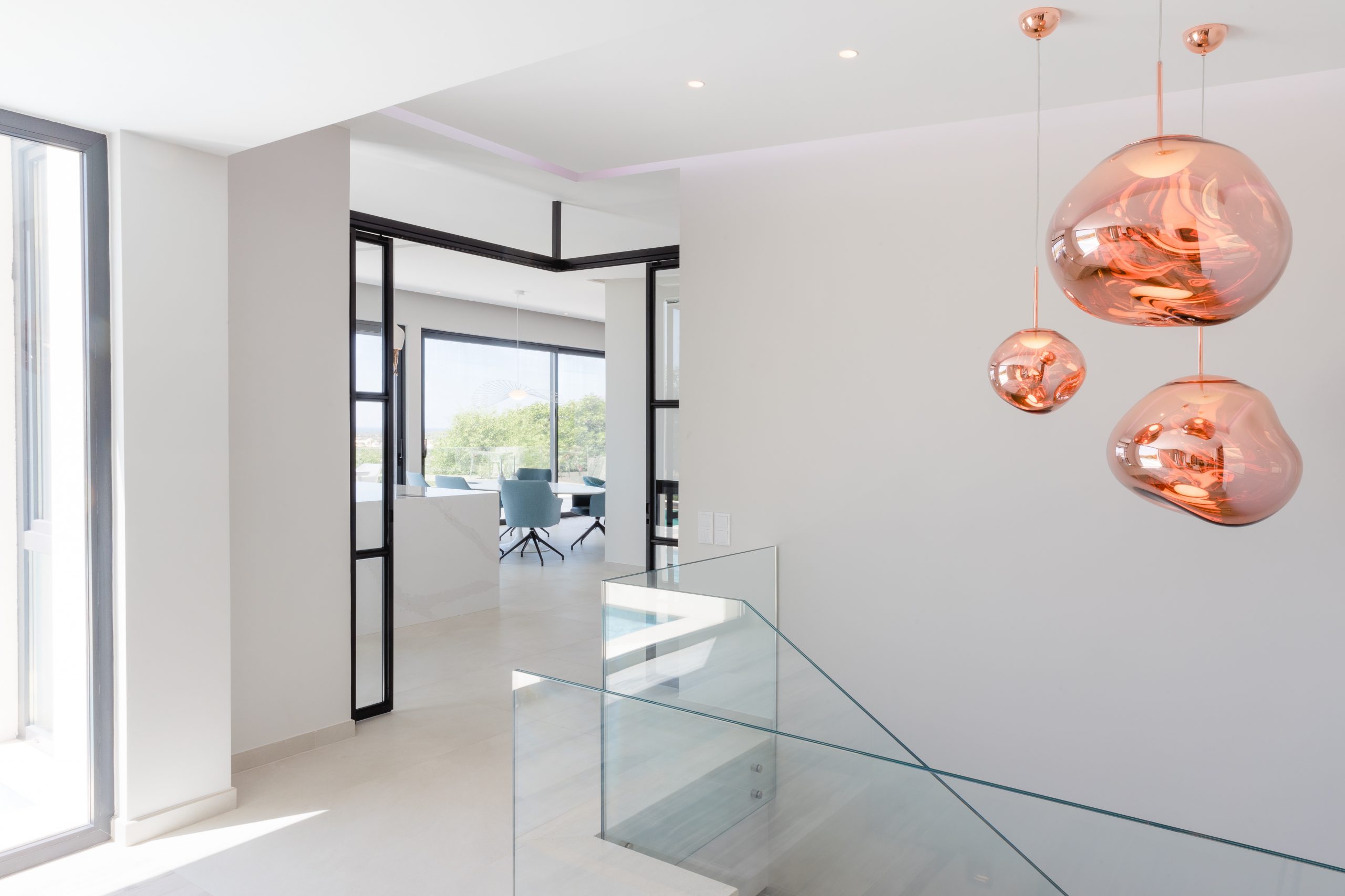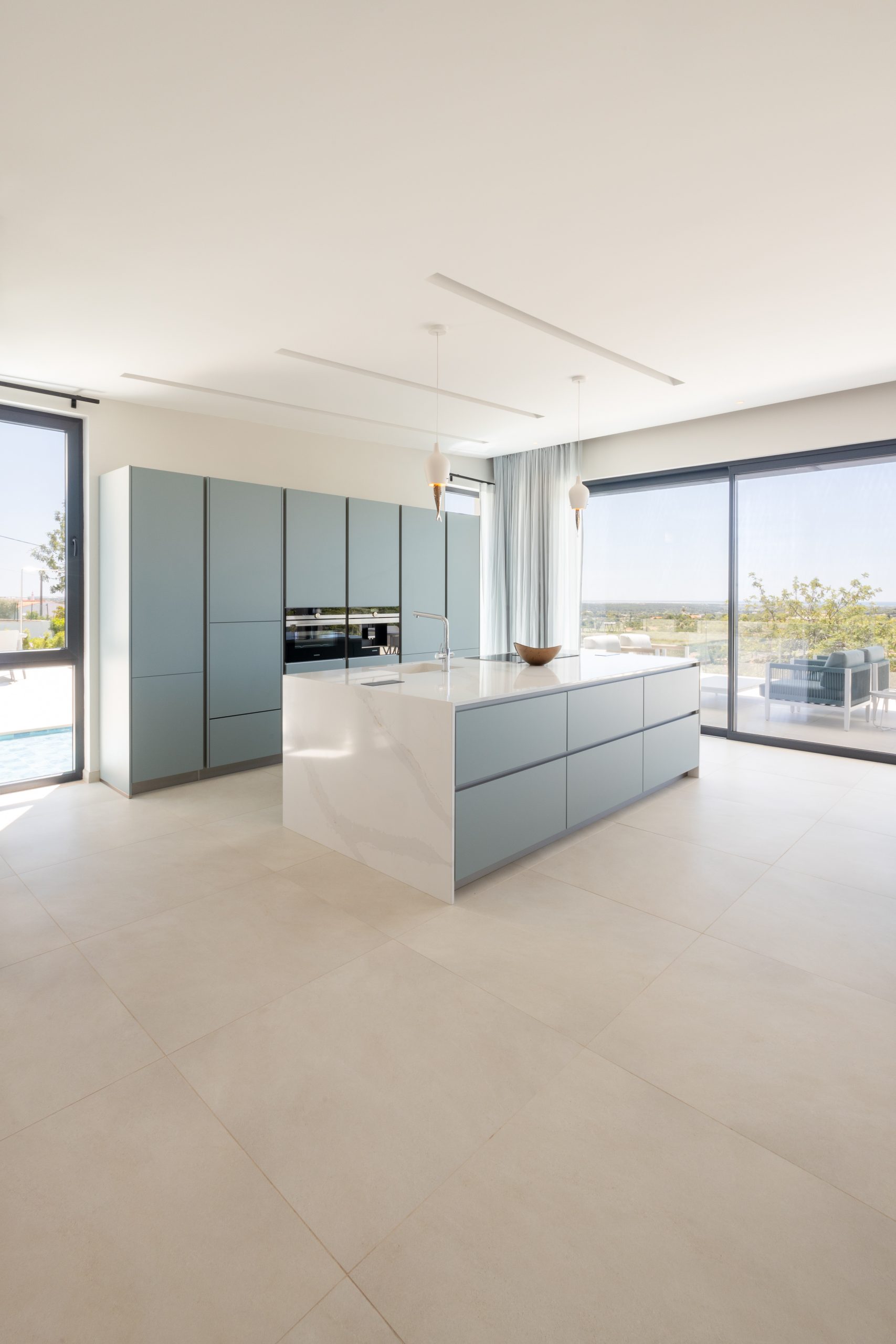 As the front door to this gorgeous farmhouse swings open, it reveals a wider-than-normal hallway marking the joining of two homes – an old farmhouse renovated with muted beige and turquoise tones and a new development featuring open-plan spaces and even wider windows. Your gaze, however, can’t help but be drawn down the hallway to the pool shimmering beyond large French doors and the sea beyond, lining the horizon – one of the main features of the home and the client’s primary requirement: seeing the ocean as they work.