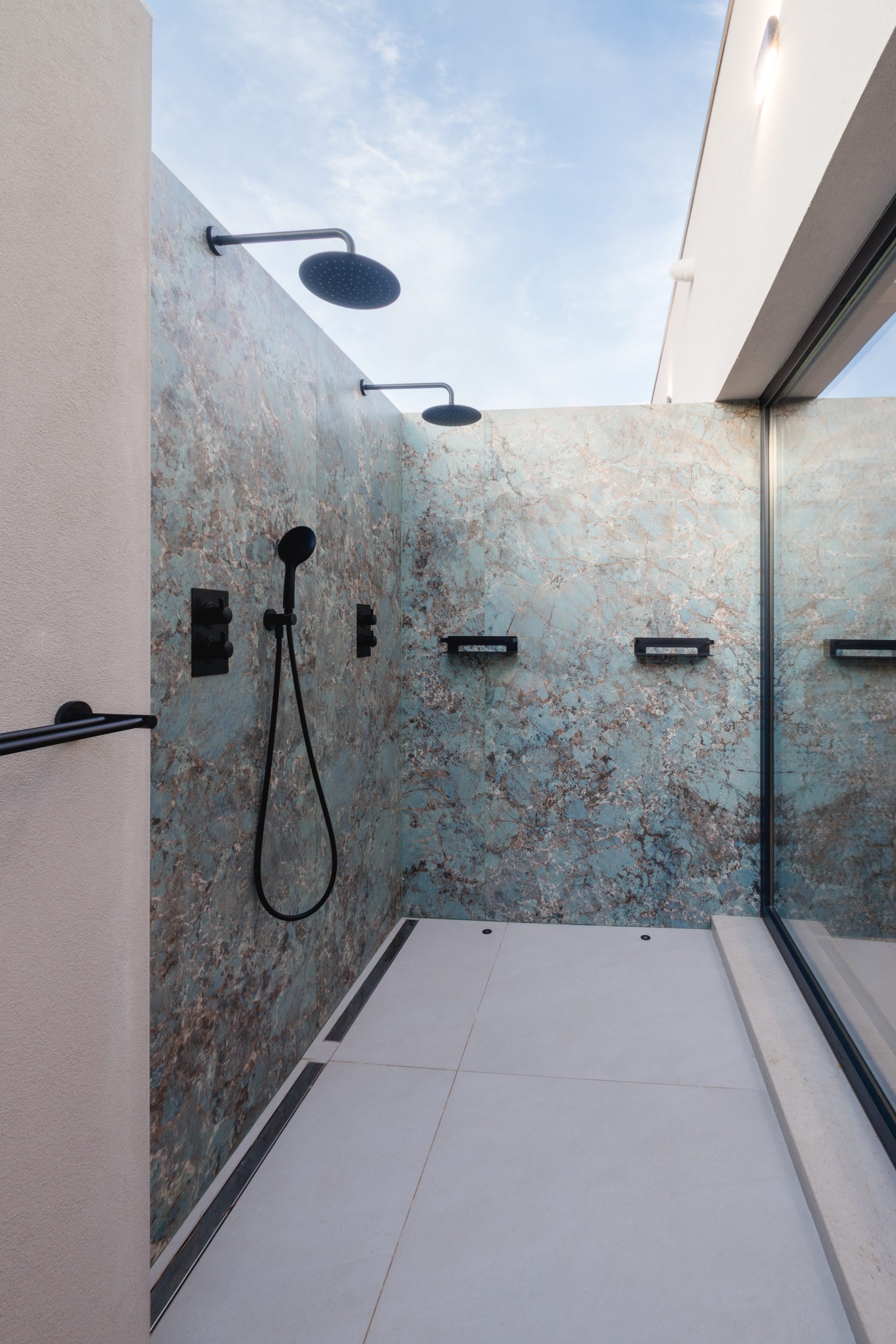 Airy spaces are made cosy through the use of timeless yet traditional bamboo ceilings and outdoor showers featuring palm trees and natural rock textures providing for paradisiacal bathing, making this a year-round holiday home perfect for living in. Though built for use as two separate spaces, continuity is maintained through uniform materials and colours throughout, echoing water shades and motifs to bring the sea even closer to this well-placed house on a hill.