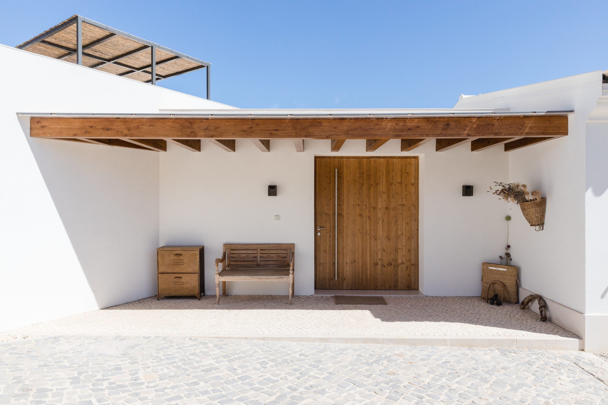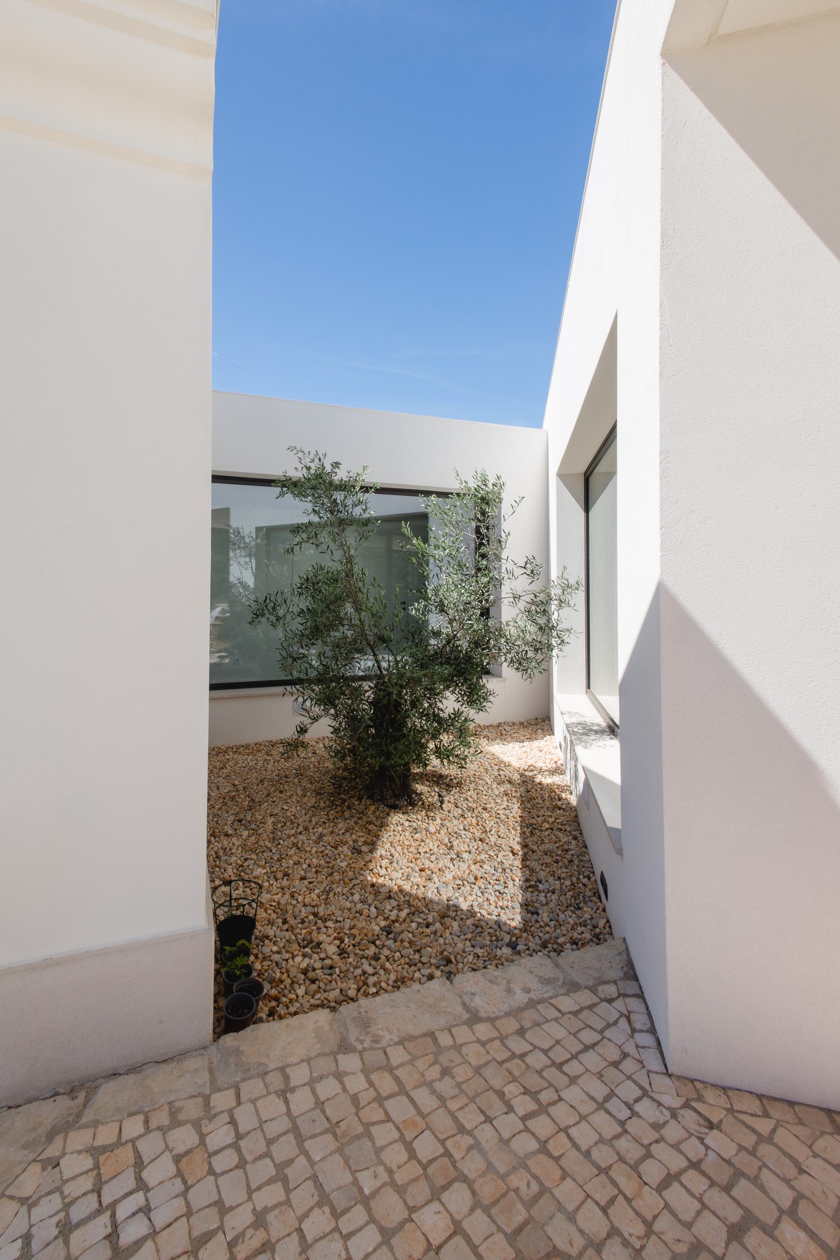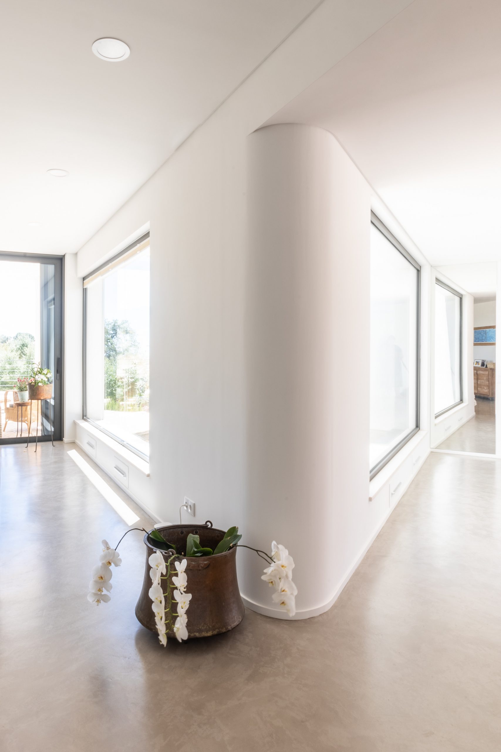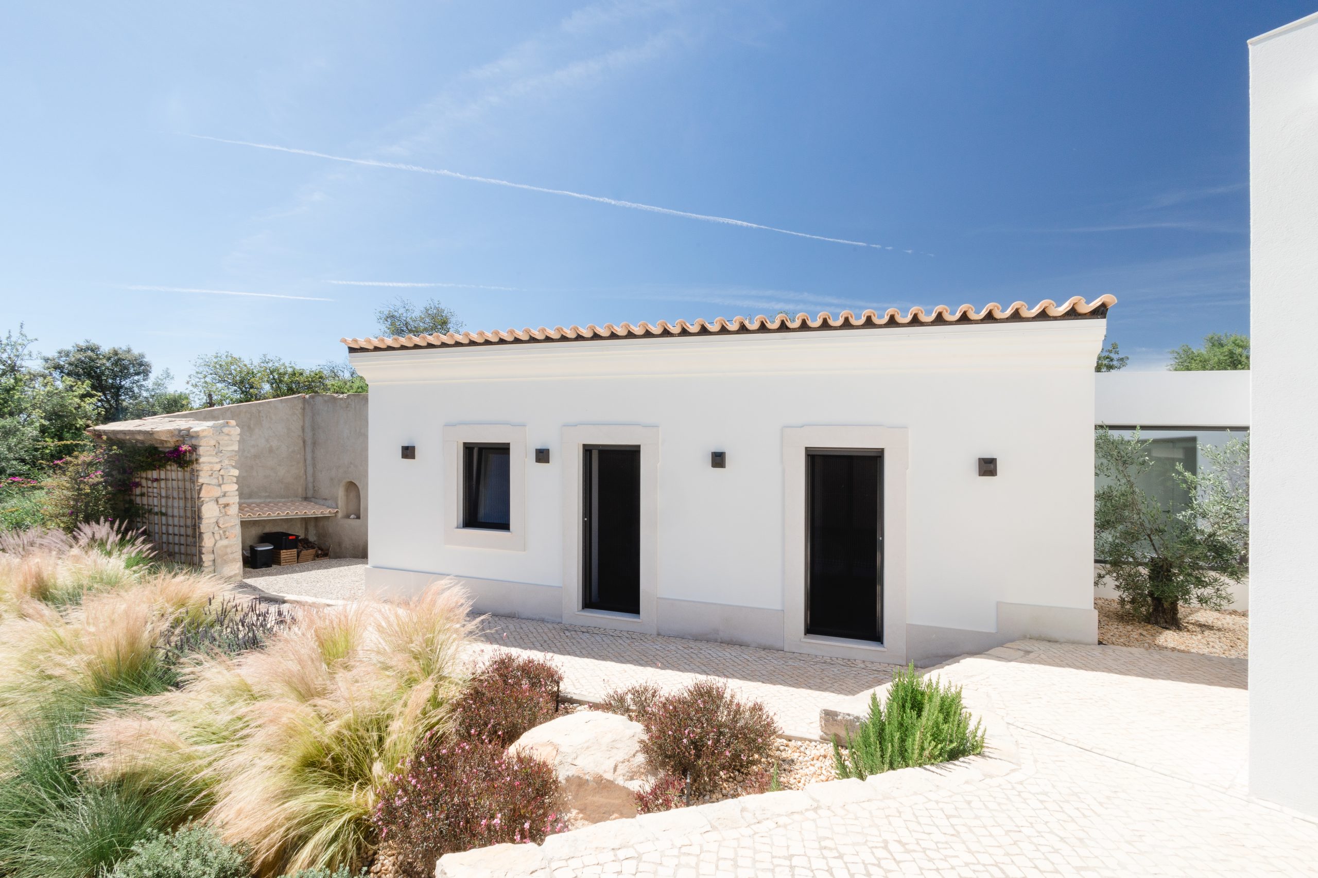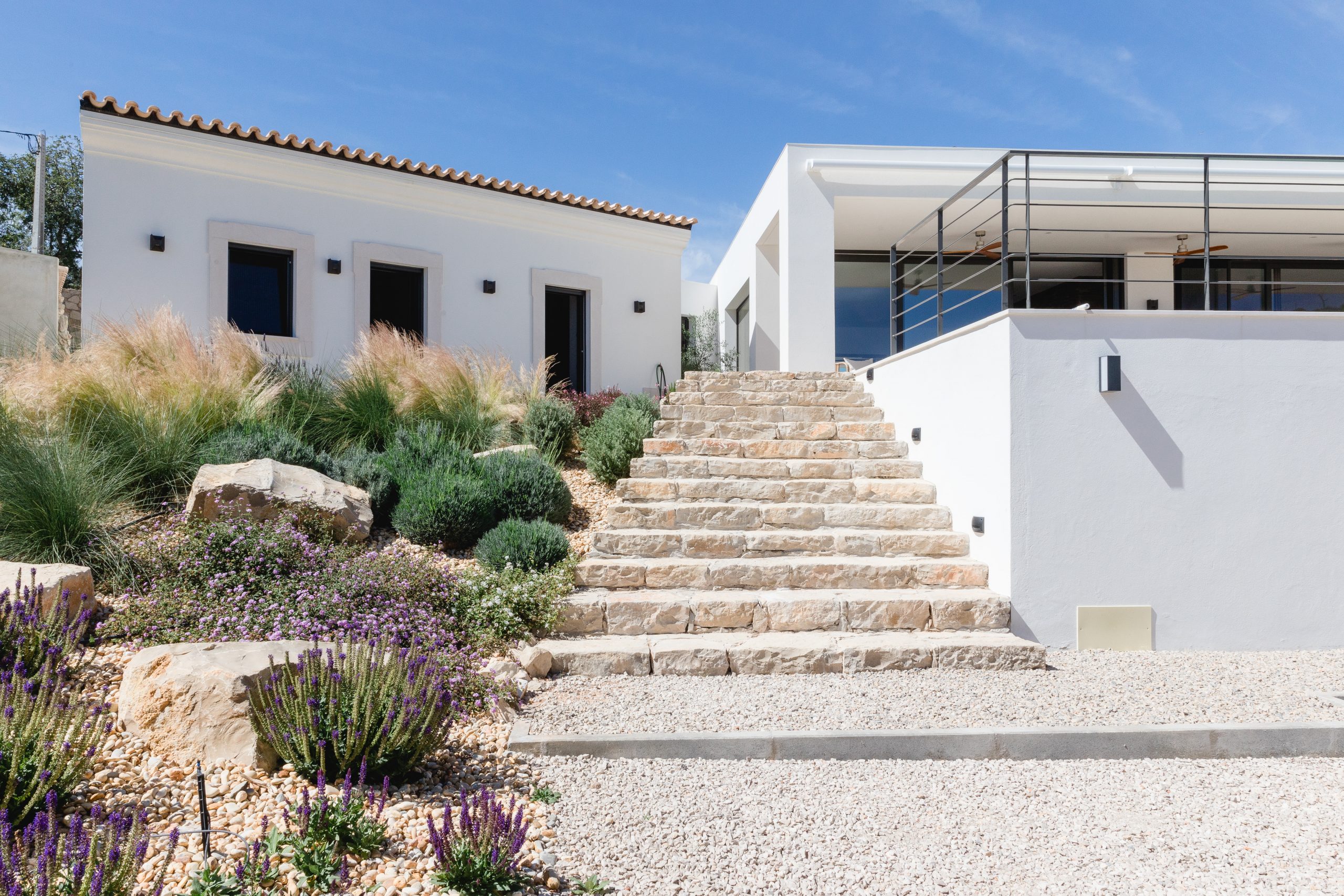 The brand-new home on a hill has full sun exposure year-round, which, in the blistering heat of the Algarve, could become uncomfortable in summer. However, built according to passive house principles, the house features several elements that ensure inside temperatures are kept constant and comfortable. These include a roof overhang to the south to protect from direct sunlight while still allowing for passive winter heating to take place. High-performance windows provide energy efficiency, used alongside energy-saving appliances and water-saving landscape design to ensure maximum harnessing of all the elements, allowing this build to make the most of the nature it is built in and around.
