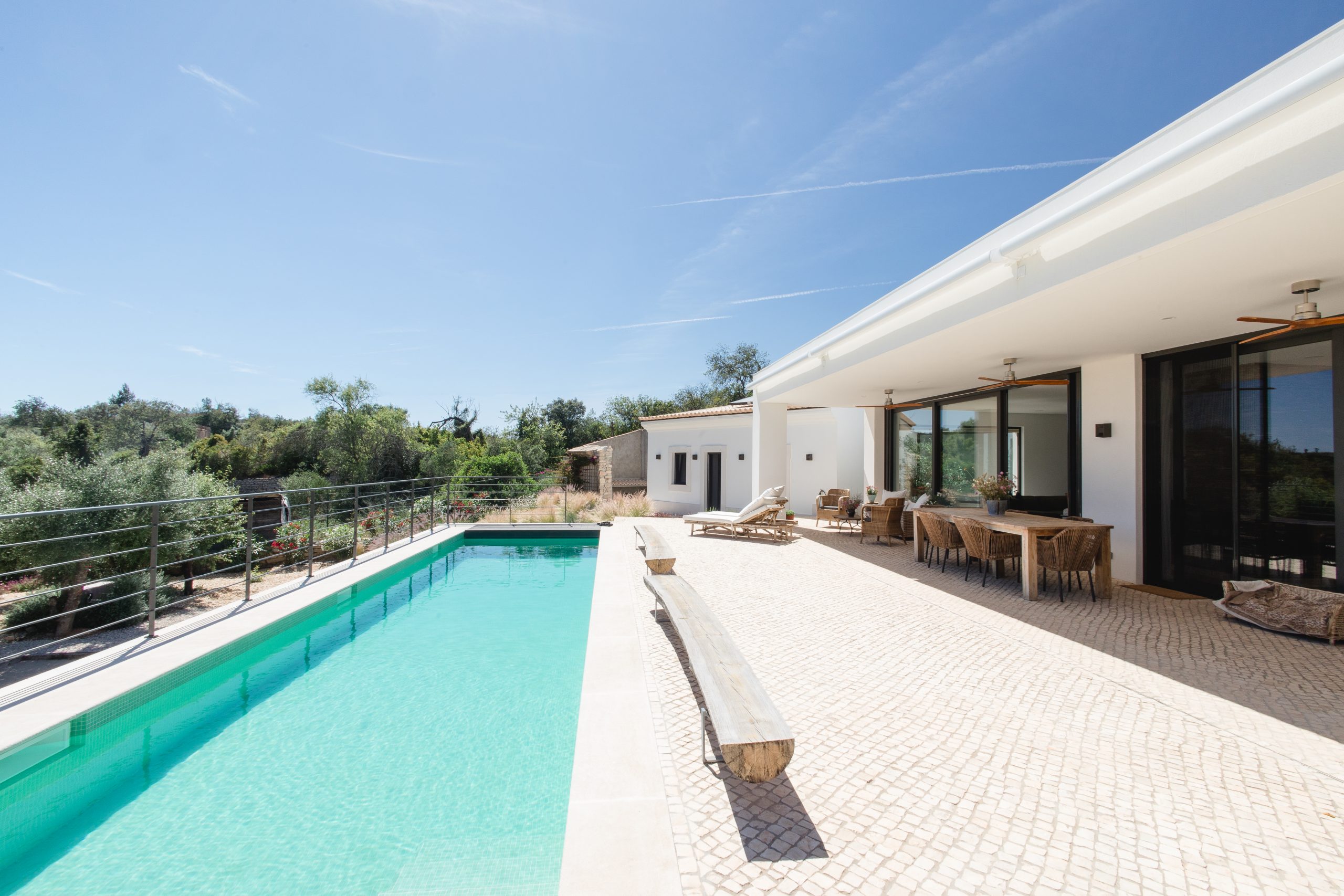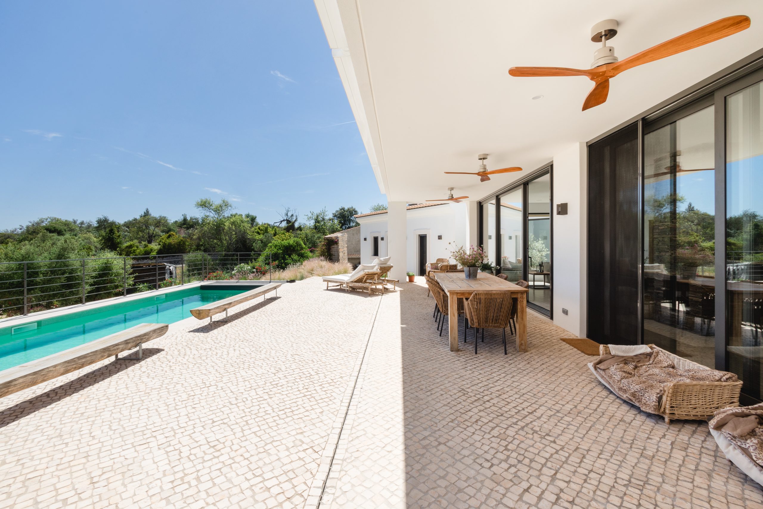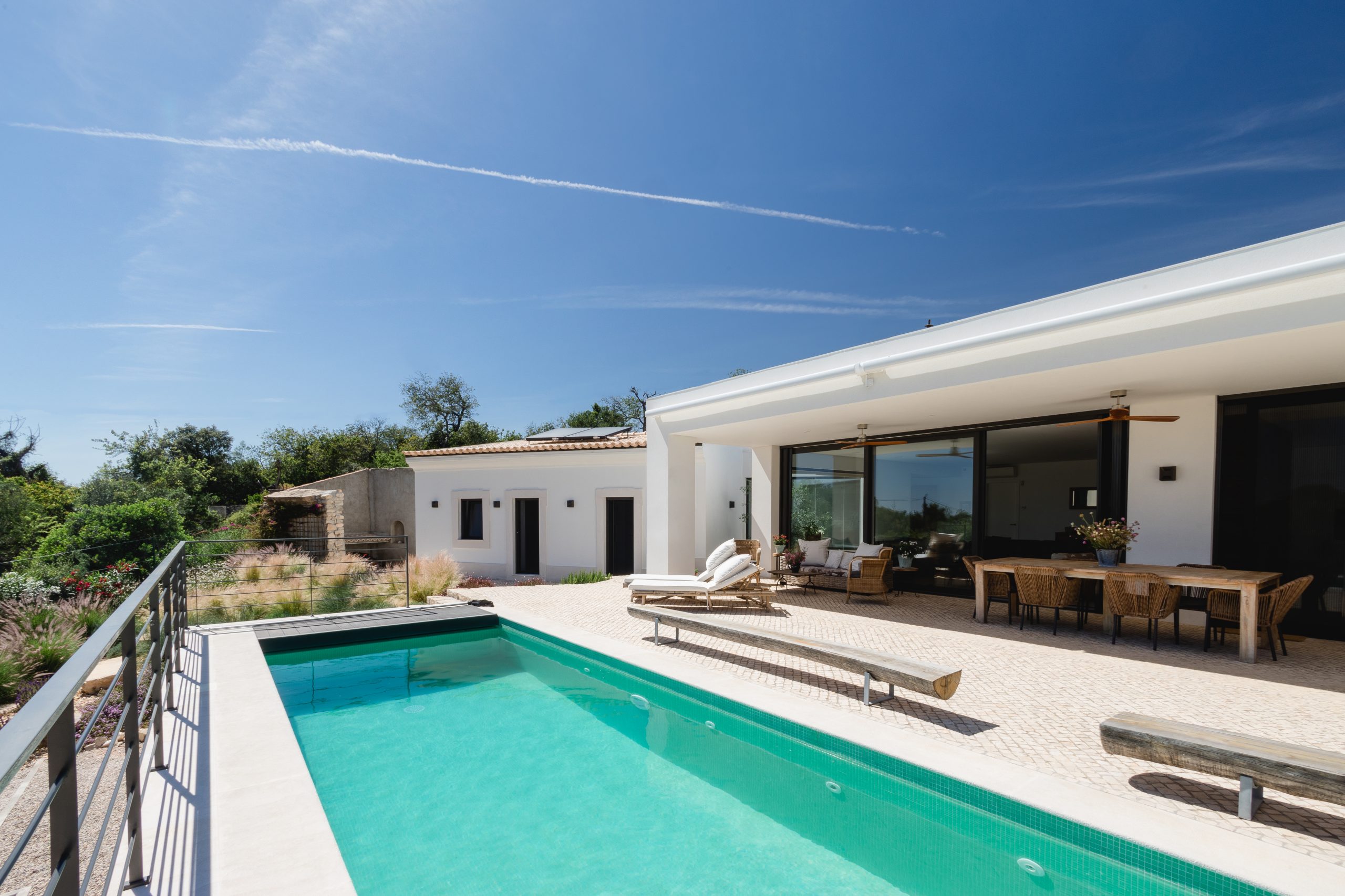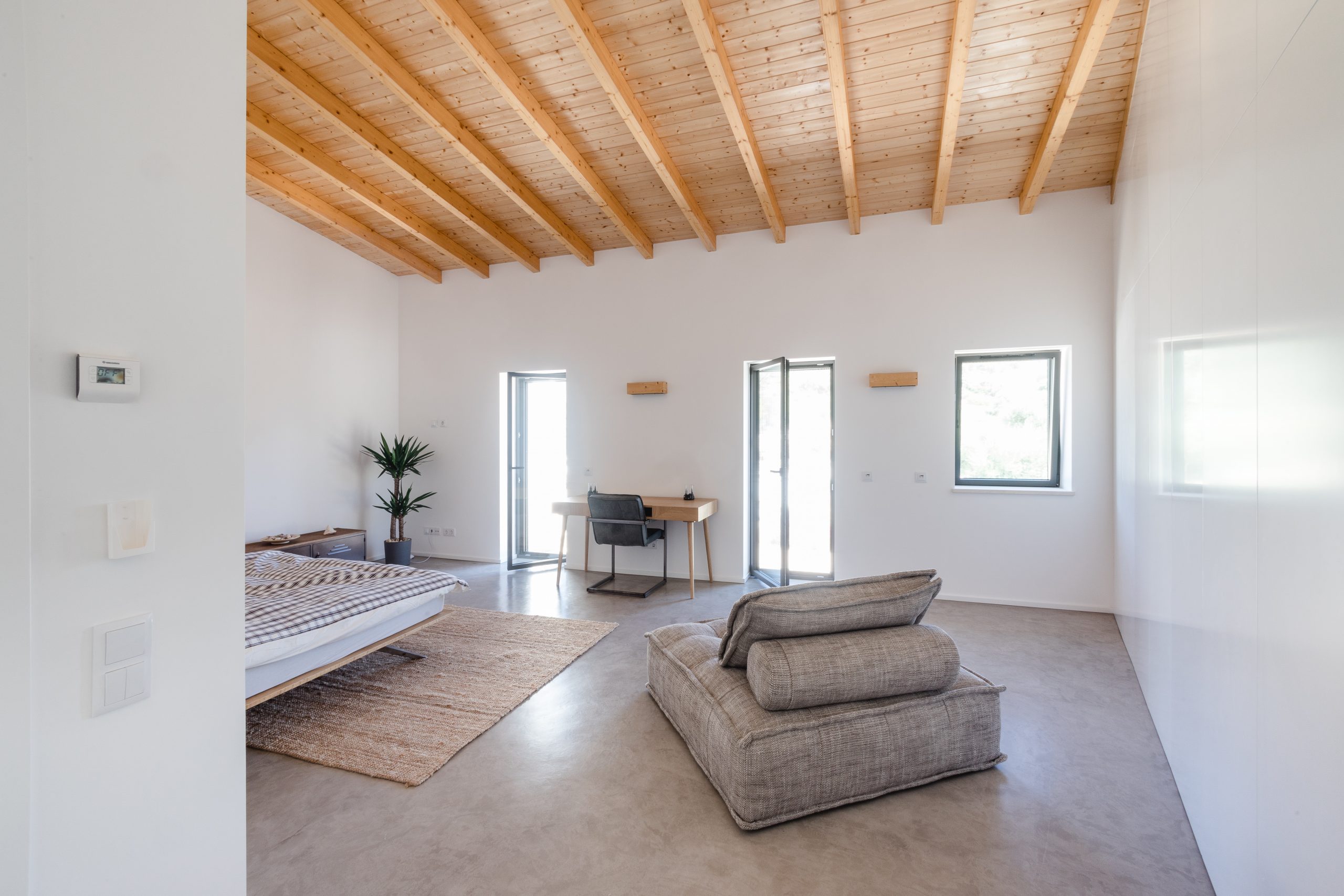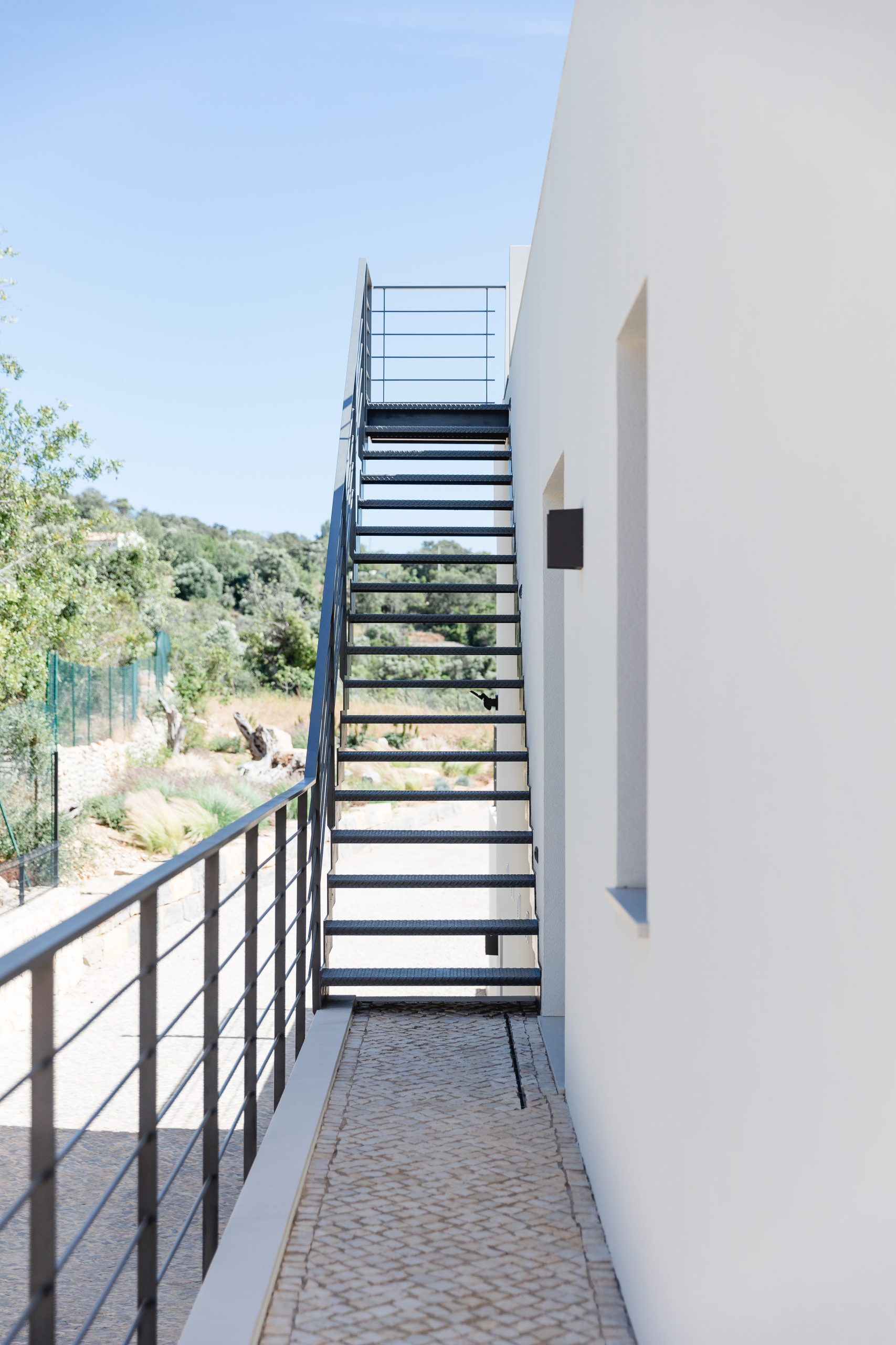 The brand-new home on a hill has full sun exposure year-round, which, in the blistering heat of the Algarve, could become uncomfortable in summer. However, built according to passive house principles, the house features several elements that ensure inside temperatures are kept constant and comfortable. These include a roof overhang to the south to protect from direct sunlight while still allowing for passive winter heating to take place. High-performance windows provide energy efficiency, used alongside energy-saving appliances and water-saving landscape design to ensure maximum harnessing of all the elements, allowing this build to make the most of the nature it is built in and around.