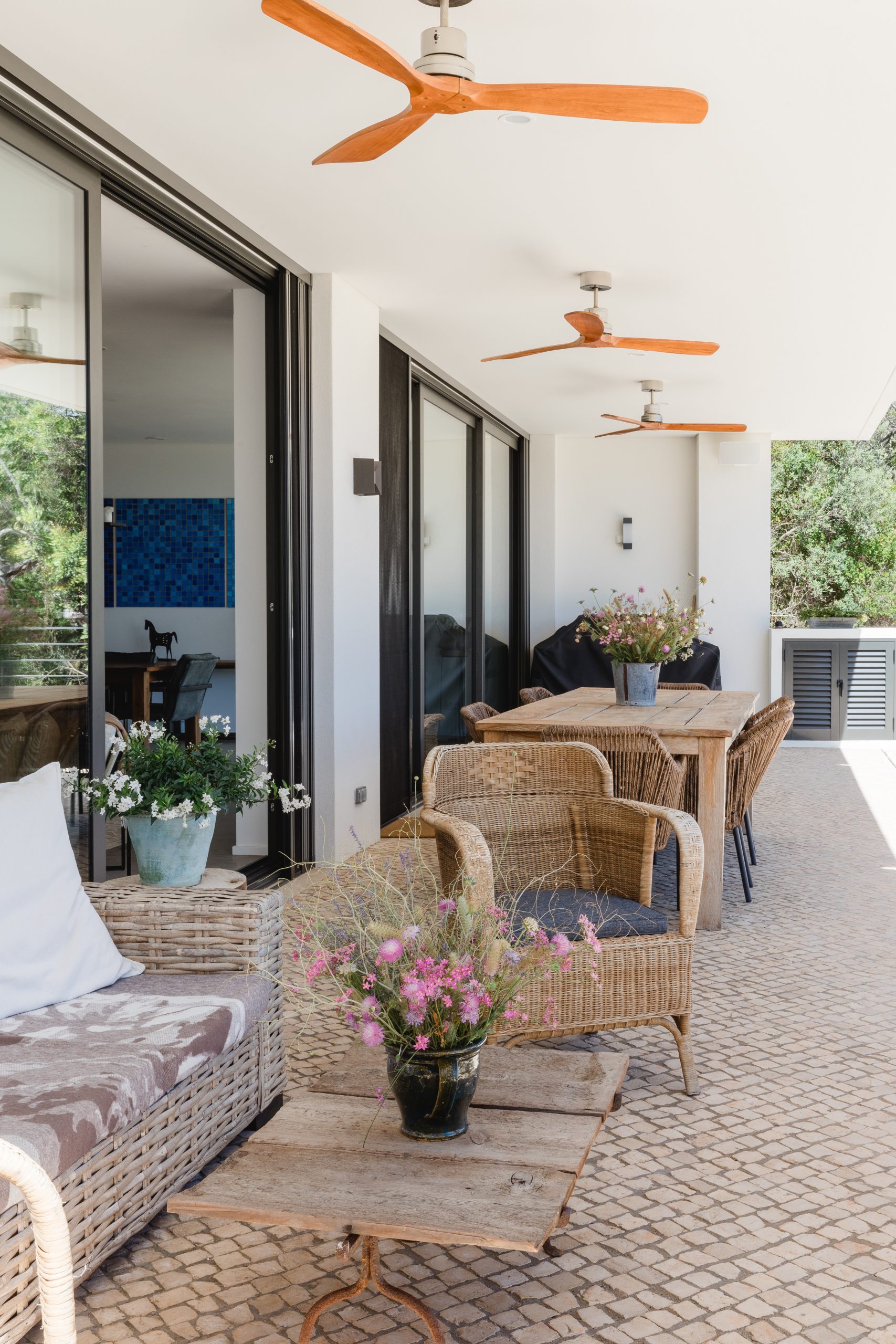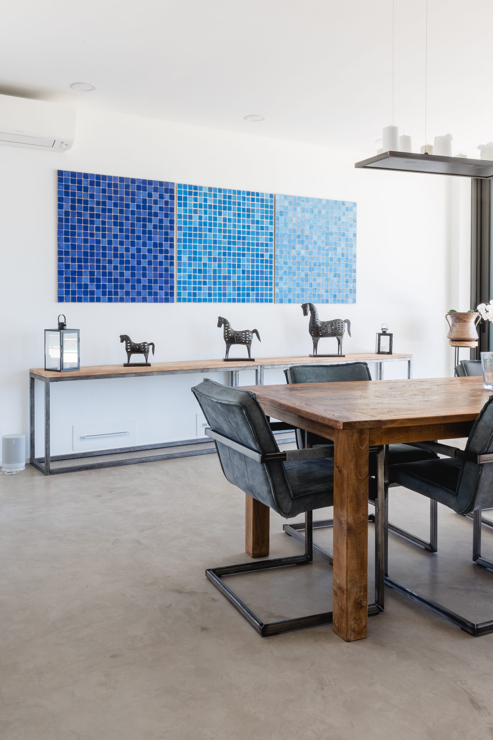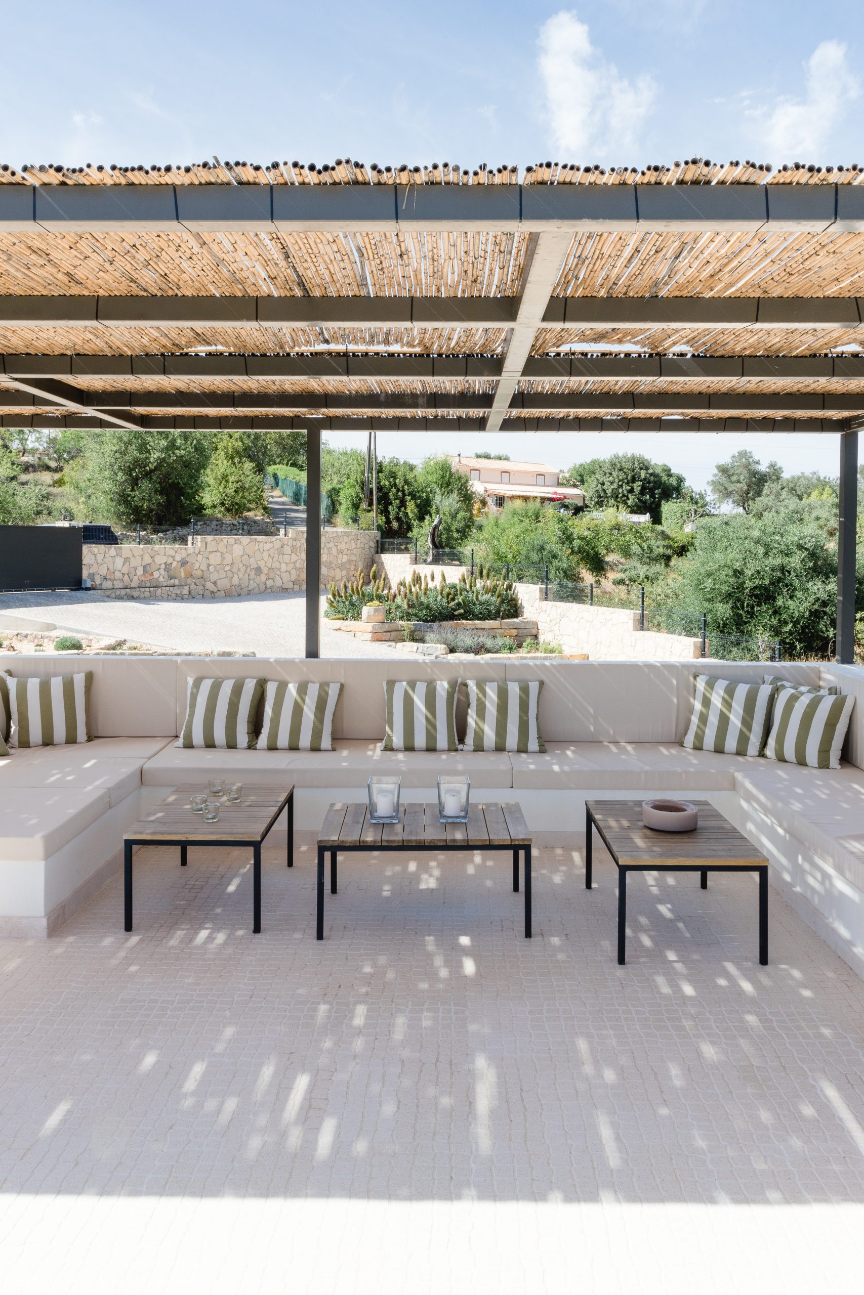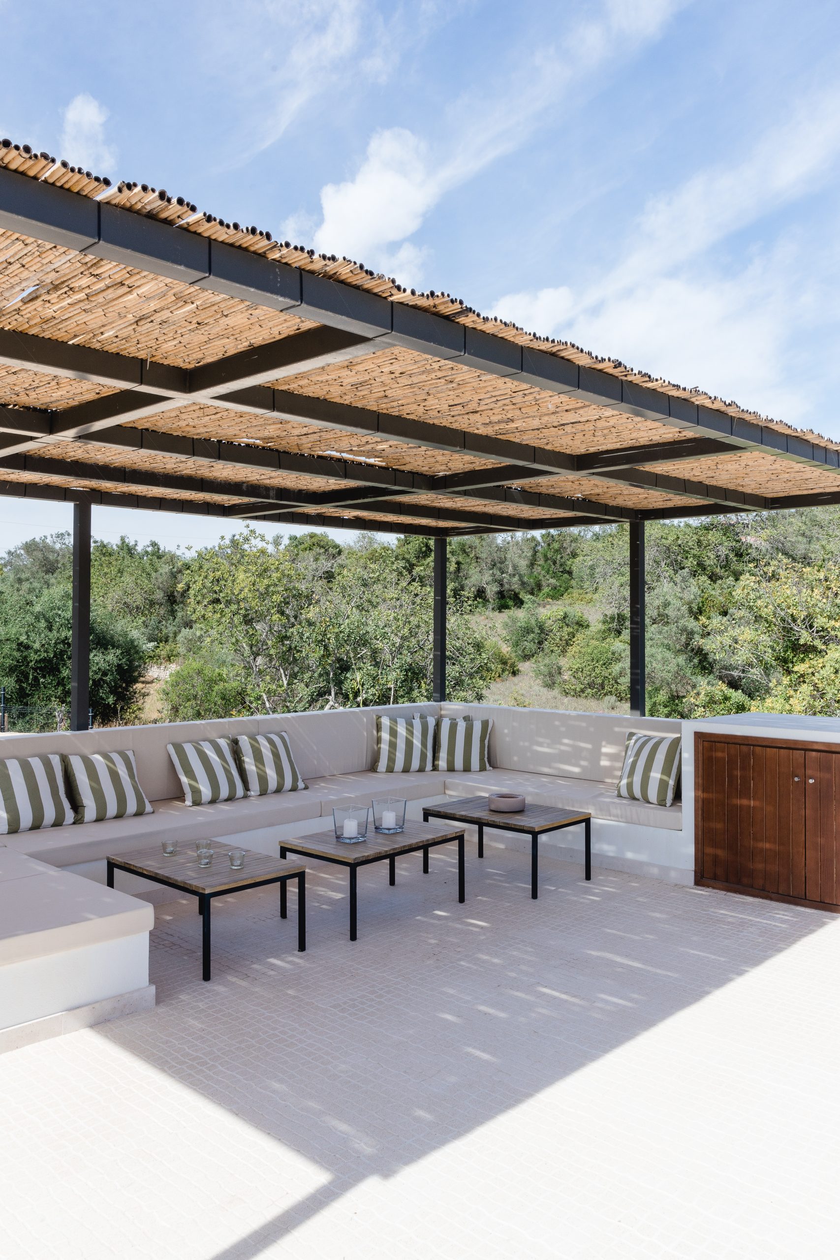This nature is reflected in the local grasses and trees used in garden areas, where olive and carob trees abound. The wood theme carries on into the house’s terraced sections, which feature gorgeous thick log benches, bamboo sunbeds and wicker furniture, blending lines between in and out.